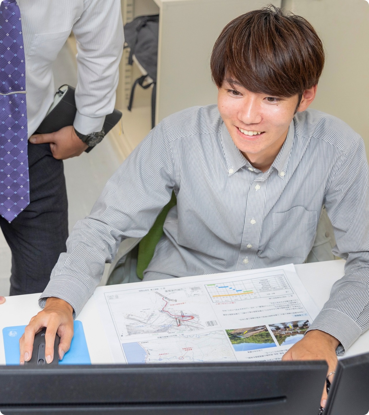 - 大手では外注することも多い現地調査を、私たちは自分たちの手で行います。だからこそ、現場のリアルな感覚を大切に、責任を持った提案ができます。好きなことに専門家として向き合い、社会に貢献したい。そんな想いを持つ方と、一緒に働ける日を楽しみにしています。