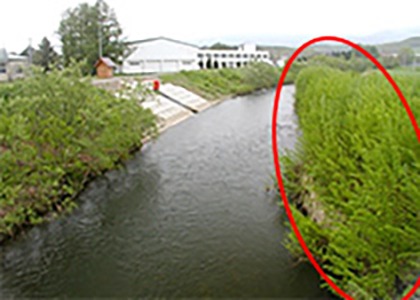 河川に繁茂する河畔林は、生態系にとっては貴重な生息場となりえますが、あまりに繁茂しすぎると、洪水時の河川水が流れにくくなり、治水の安全度を下げてしまいます。そこで、河畔林をどの程度伐採すればよいかを不等流計算により評価して、生態系に配慮しながら計画を立てます。 その際、ヤナギなどの樹木を一斉に伐採してしまうと、伐ったところから再び枝を伸ばし(萌芽)、伐採する前よりも治水の安全度が下がる場合もあります。そのため、伐採方法もこのようなことが起こらないよう検討します。