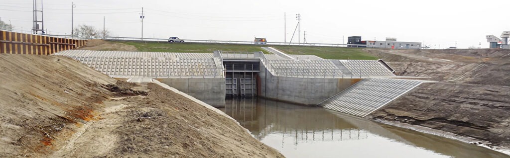 樋門は、堤防を横断する構造物で、堤防の機能を有する重要な構造物です。設計においては、堤防としての機能を確保すべく安全な構造物とするとともに、沈下対策も重要となります。また、将来にわたって考えられる最大級の地震(L2)が発生しても機能を保持するため耐震性能照査を行い、大規模災害の発生に備えます。